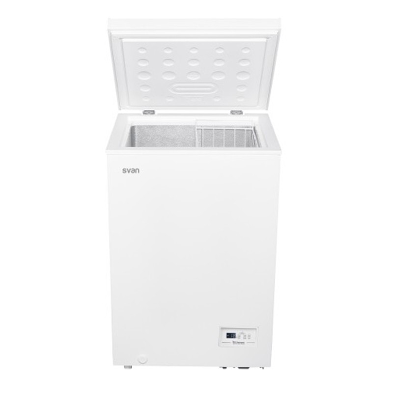 Arcón congelador SCH1000FDC, modelo con 98 litros de capacidad. Dispone de puerta abatible ciega y está equipado con el sistema DUAL-COOLING que le permite trabajar tanto en temperaturas negativas (congelación) como positivas (refrigeración).