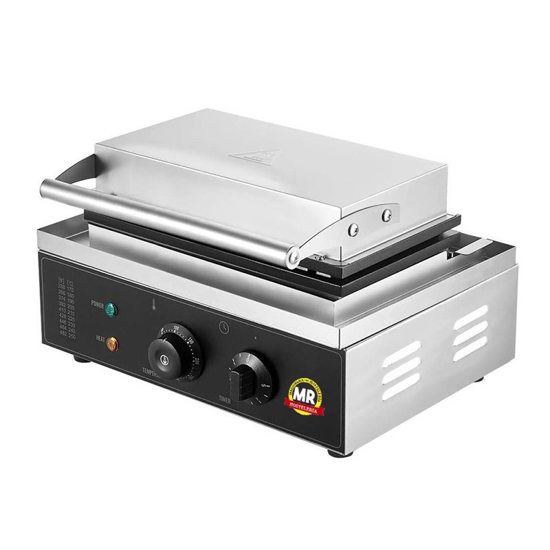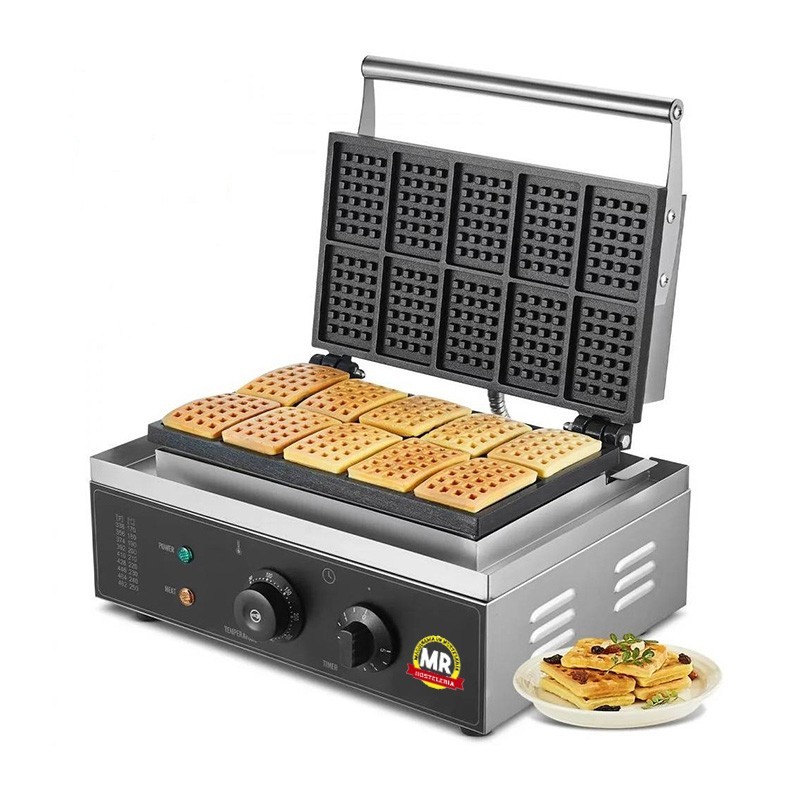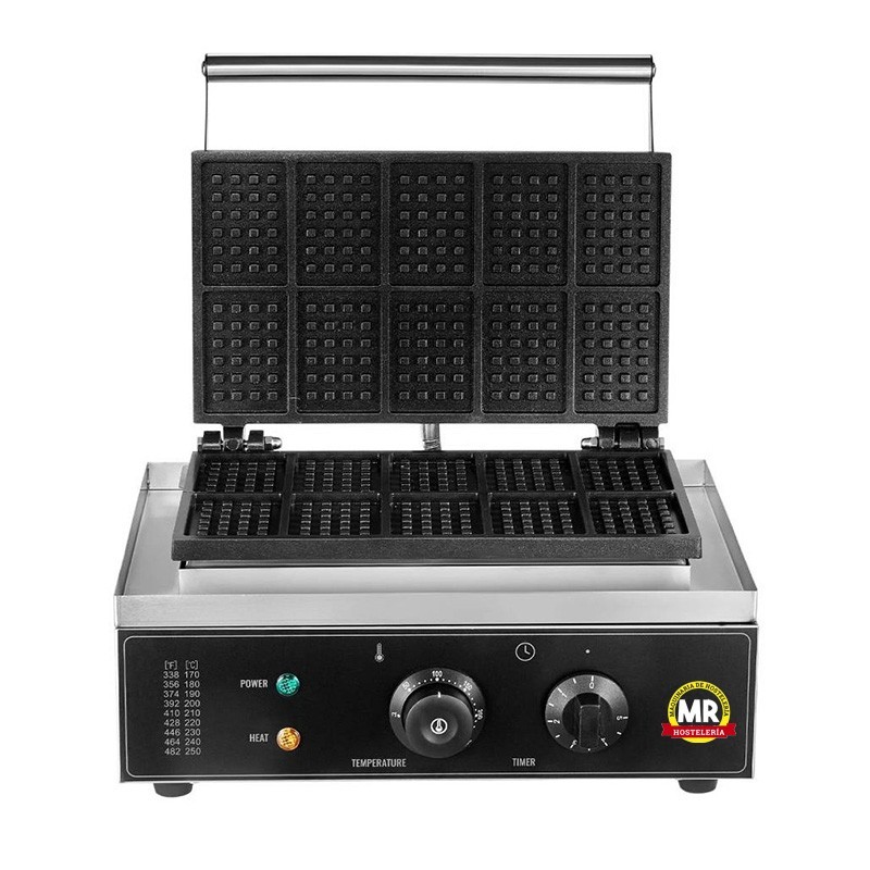 Gofrera para 10 gofres rectangulares. Ideal para uso profesional, proporciona una distribución del calor de manera rápida y eficiente.